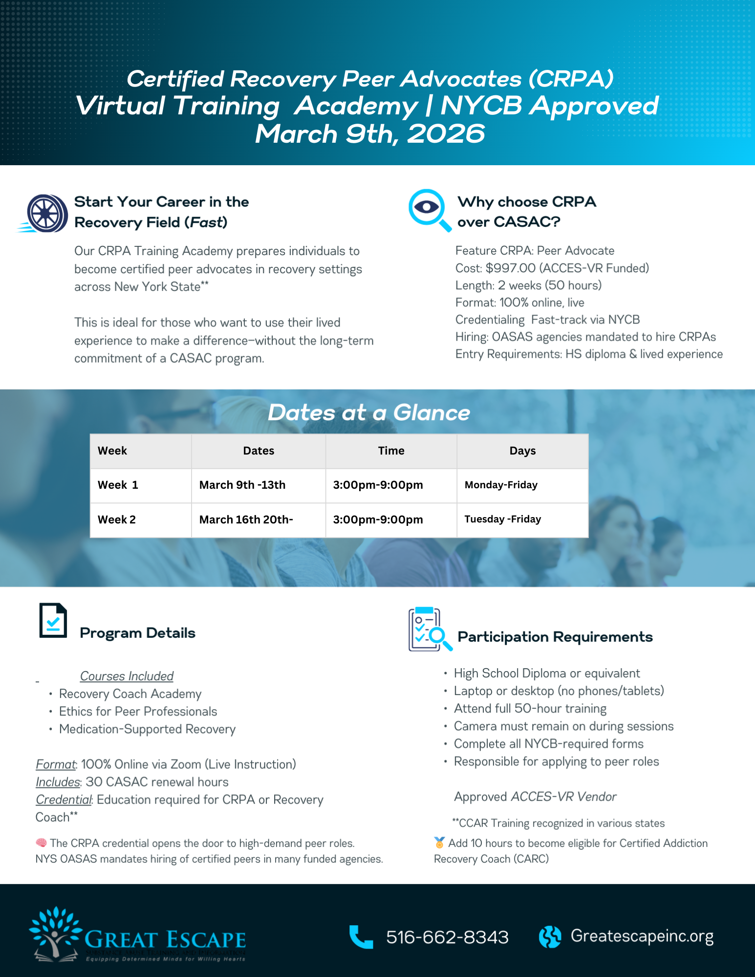 Approximately every six weeks, Great Escape offers a 7 hour CASAC test prep course that addresses all of the areas of study needed to pass the exam the first time.